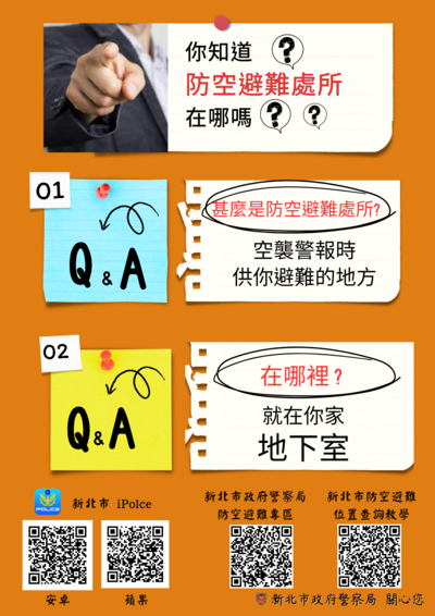 請多加使用「新北市iPolice APP」及「警政服務APP」,強化緊急事件應變作為與熟稔防空避難設施位置路線及查詢使用方式。