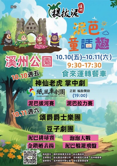 一、2025「溪州提拔泥-泥芭童話趣」活動將於114年10月10日(五)、10月11日(六)在溪州花博公園盛大登場,活動內容包括豆子劇團、掌中劇、頌爵爵士等舞台演出,並有手作體驗、夏日熱鬥泥巴競賽、氣墊遊戲區、小農文創市集等系列活動。