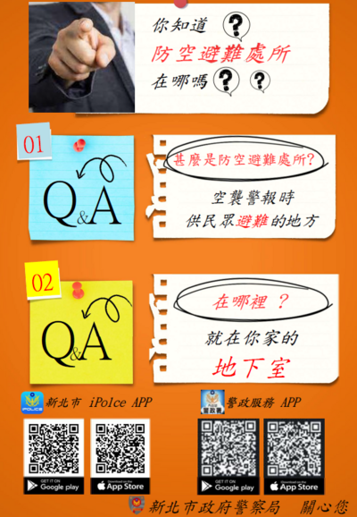 請多加使用「新北市iPolice APP」、「警政服務APP」及「消防防災e點通APP」熟稔防空疏散避難路線與位置及查詢使用方式。