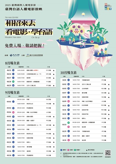 一、為推廣國家語言,訂114年8月22日至10月31日辦理「臺灣台語人權電影放映—相招來去看電影‧學台語」活動,共放映18部電影(34場次)。藉由台語電影的放映,並結合映前導讀與映後分享活動,讓大眾感受台語電影及語言魅力,亦能對於電影劇情及內容中所涉及各項人權議題延伸思考。